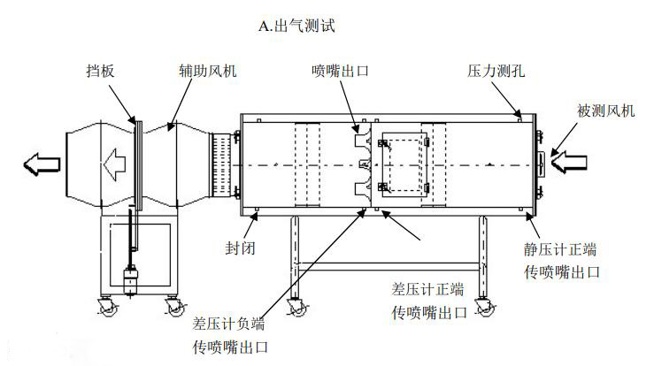测试项目:P-Q特性(流量与静压的关系)、Q-η特性(流量与效率的关系)、电流、功率。