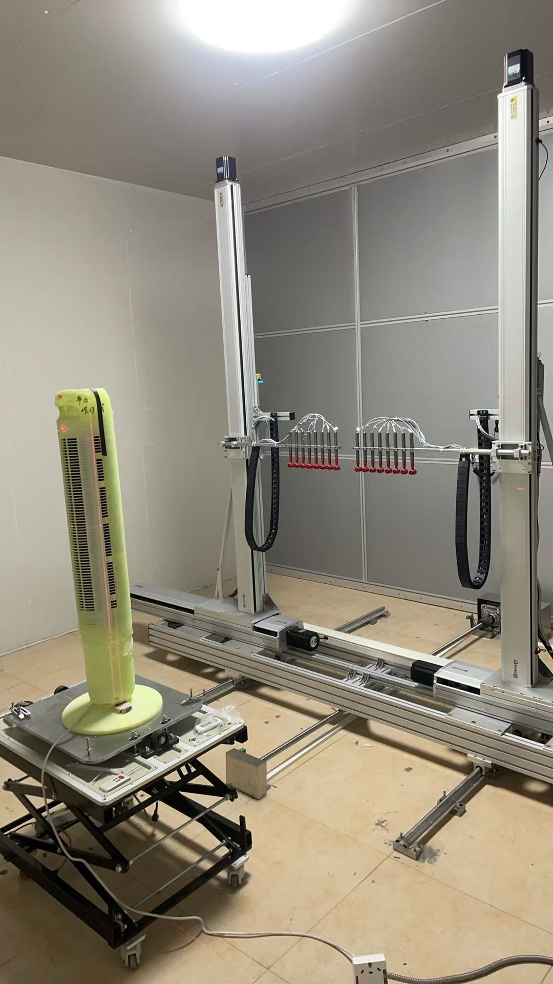 1、风量测量支架及传动机构(多个风速计水平分布,从风扇中心处处,横向方向扫描完以后,40mm的增量横向上下扫描,测点测得的所有风速都低于24m/min.停止扫描。风速计中心高度1200 mm、1500 mm可调;横向导轨行程2400mm,纵向导轨行程2000m。