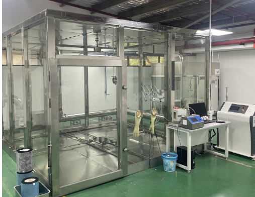 气雾试验舱需满足QB/T 5364-2019技术要求,其中气密性:试验舱的换气次数不应高于0.05 h-1,试验舱的混合度不应低于80% ,0.3μm以上粒子数应不高于1000个/L,本底值:甲醛不高于0.05mg/m³、TVOC不高于0.3mg/m³,甲苯不高于0.1 mg/m3。