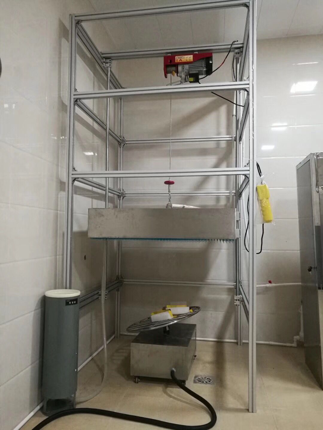 l 配备符合试验箱尺寸的可移动的模拟墙1个,模拟墙可平稳安放在试验箱内。模拟墙上有安装孔,以便安装样品。主要是做类似电表的安装,采用格栅式设计,每层和每格的间距可调,以适合不同尺寸的电表(一个电表7KG左右).方便拆装。.