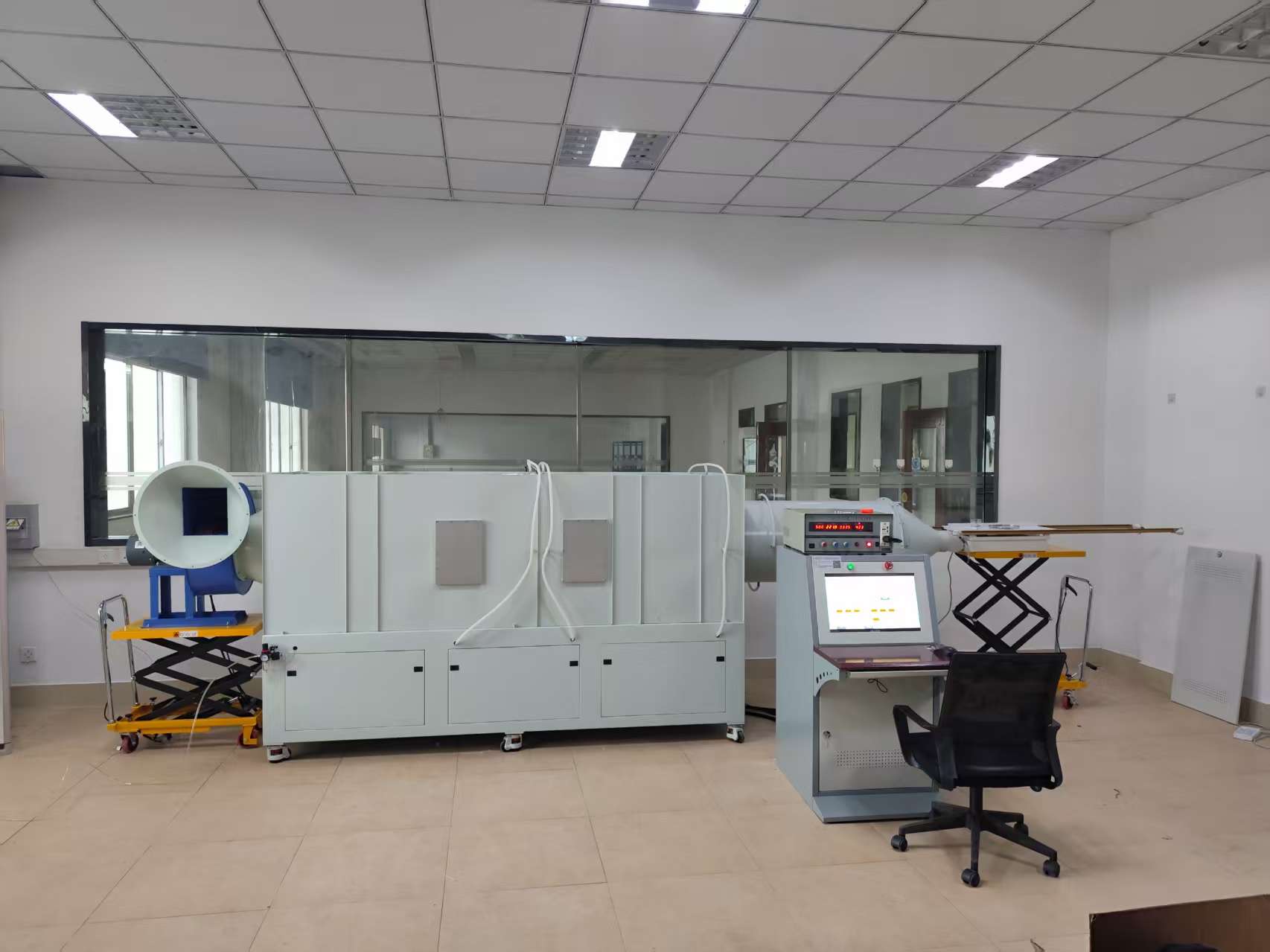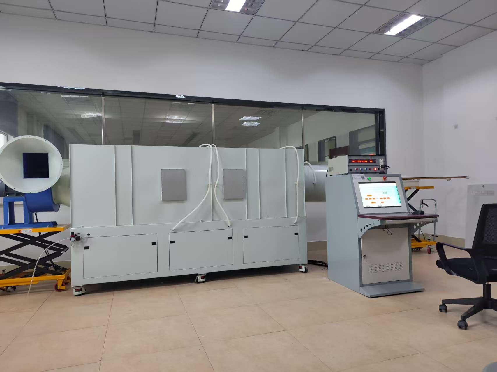 主要构成:风量测试风洞、辅助风机、测控电气柜(包括变频电源、电参数测量仪、压力变送器、转速表等)、品牌电脑、打印机、试品升降台、试品安装法兰及测试风管。