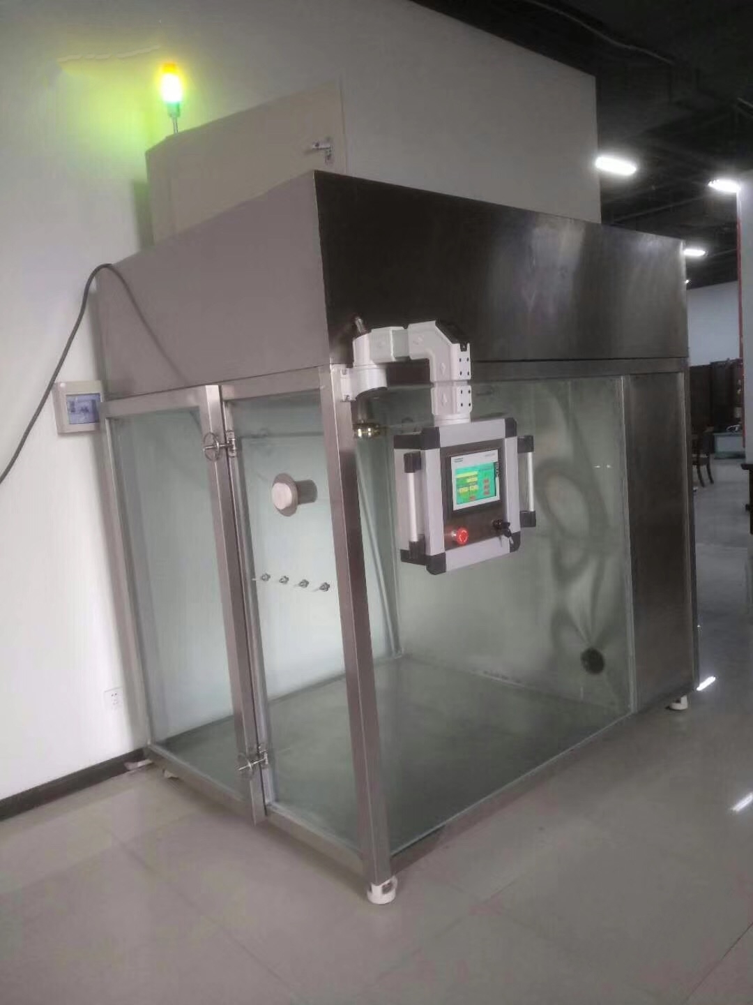为臭氧浓度检测时空气净化器的工作室。工作室采用密闭设计,内部最大尺寸为2.5m(宽)×3.5m(长)×3.0m(高),箱体采用六面保温库板制作,箱体内侧表面安装有聚乙烯板。内部安装有不锈钢照明灯具,侧面库板预留有试验电源提供及臭氧采集孔。门体尺寸为0.8m×2.0m,安装有玻璃观察窗。