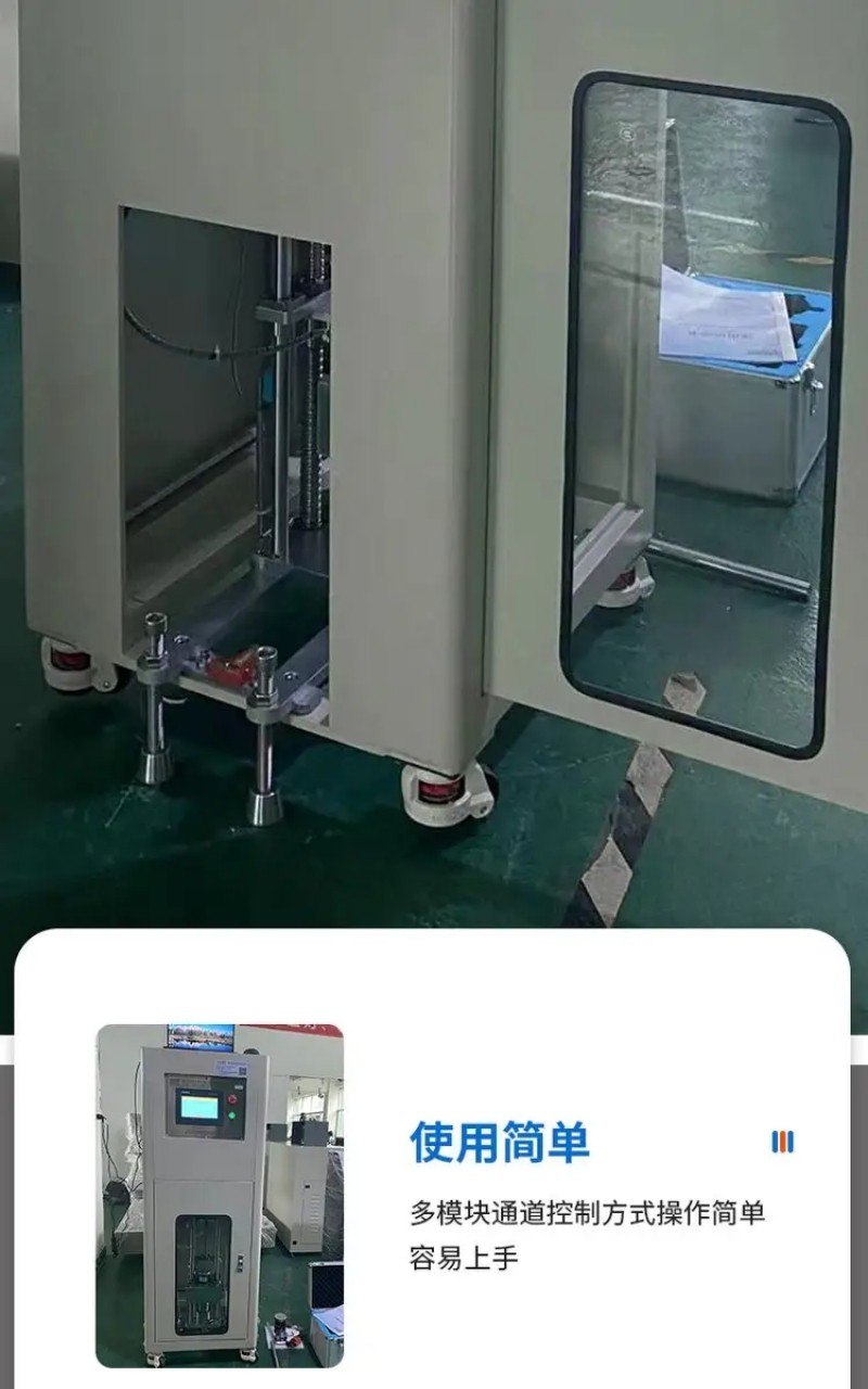 25、整机架构:测试箱体与控制台分开,测试箱体钢制架构,外表烤漆,零件电镀处理,配置重载脚轮,方便移动,操作时可固定调平;