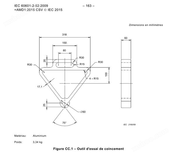 主要参数规格:楔形工具是根据IEC60601-2-52图CC.1要求设计制作而成,用于评估医疗器械的V型开口风险程度,被测区域是B和C的V形开口,本三角形测试工具材质为铝,重量3.34kg.