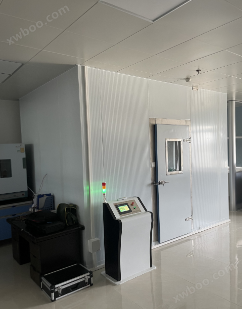 为臭氧浓度检测时空气净化器的工作室。工作室采用密闭设计,内部最大尺寸为 2.5m(宽)× 3.5m(长)×3.0m(高),箱体采用六面保温库板制作,箱体内侧表面安装有聚乙烯板。内部安装有不锈钢照明灯具,侧面库板预留有试验电源提供及臭氧采集孔。门体尺寸为 0.8m×2.0m,安装有玻璃观察窗。