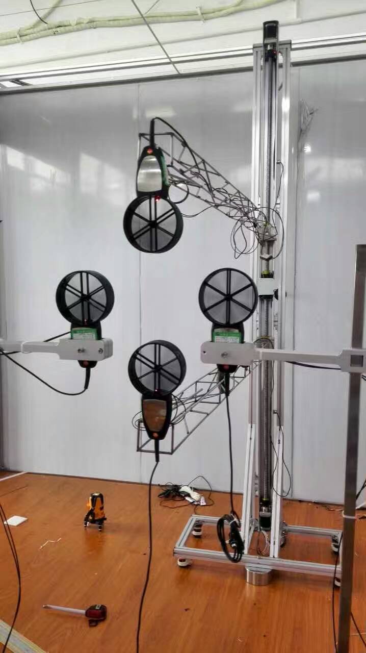 本风量测试装置依据的要求,为了行走方便,并且因为测试方法基本一样,能符合台扇、璧扇、落地扇及柱扇等风量测试要求.采用四个风速表采集风速(测试平面有原有2个水平风速表的基础上在垂直方向增加2个风速表)来代表同一圆环上的平均风速。