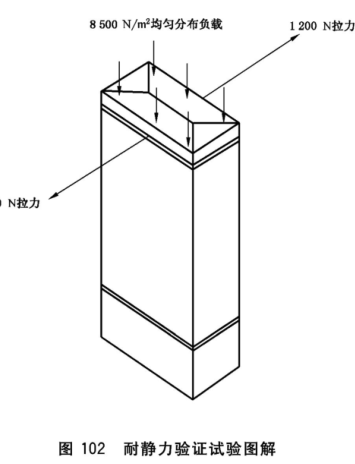 试验2:应在外壳前部和后部的顶角依次施加1200N的力,时间5min,试样在设备上可旋转90°,对侧面亦可施加推力,满足产品4个侧面都需测试的要求;