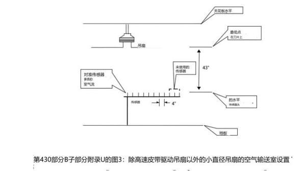 将多头吊扇悬挂在天花板上,使其中一个吊扇头位于 传感器 1 的正上方(即,位于轴 A、B、C 和 D 的交点 处)。居中式吊扇扇叶所能达到的最低点与风速传感器 之间的距离应与所有其他小直径吊扇的相同(参见本附 录图3)。如果多头吊扇具有可关闭的摆动功能(即, 扇叶相对于天花板改变其旋转轴),请在测量风速之前 将其关闭。如果任何多头吊扇未预装叶片,则仅将叶片 安装在位于传感器轴线交点正上方的扇叶上。(即使多 头吊扇的扇叶通常在所有扇叶都安装叶片时都会摆动, 但如果居中式吊扇是唯一安装叶片的扇叶时不摆动,则 该吊扇仍需接受此测试程序。)如果所有扇叶均已预装 叶片,则请按照本附录第3.3节测量风速,但只需打开居 中式吊扇即可。在所有风扇头上安装风扇叶片并打开任 何振荡功能(如果有)的情况下,分别进行功耗测量。 3.2.4. 气流不直接向下的吊扇的测试设置 对于气流并非直接向下的吊扇,在测试之前,请调整 吊扇头,使气流尽可能垂直。对于无法实现完全垂直气 流方向的吊扇,请调整吊扇(或风扇头,如果吊扇是多 头风扇)的方向,使任何剩余的倾斜都与四个传感器轴 线之一对齐。不是只测量吊扇正下方的传感器的风速, 而是要测量沿该轴线的所有传感器的风速,以及相对于 该轴线成 180 度方向的轴线的风速。例如,如果倾斜方 向沿 A 轴,则要测量沿 A-C 轴的所有传感器的风速。